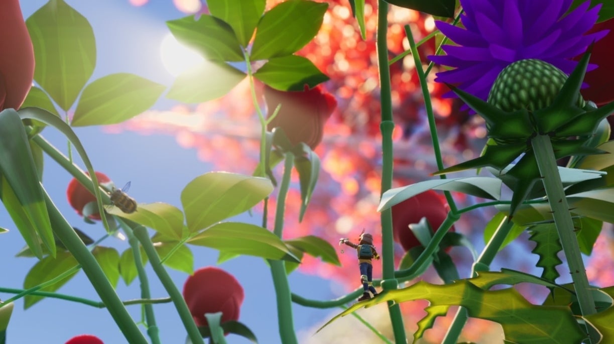 I start the demo underground, soft earth leading off in several directions. I wander for a bit, picking up stems of smaller plants and eventually find a small geodesic dome – a place where I can analyse the things I find. My job is just to explore for now, explore and gather things and work out what’s nearby. I see ants, and a ladybug that I absolutely refuse to mess with. I round a corner and golden sunlight lances through the grass – grass which is so thick I’m going to need a tool to cut through it.